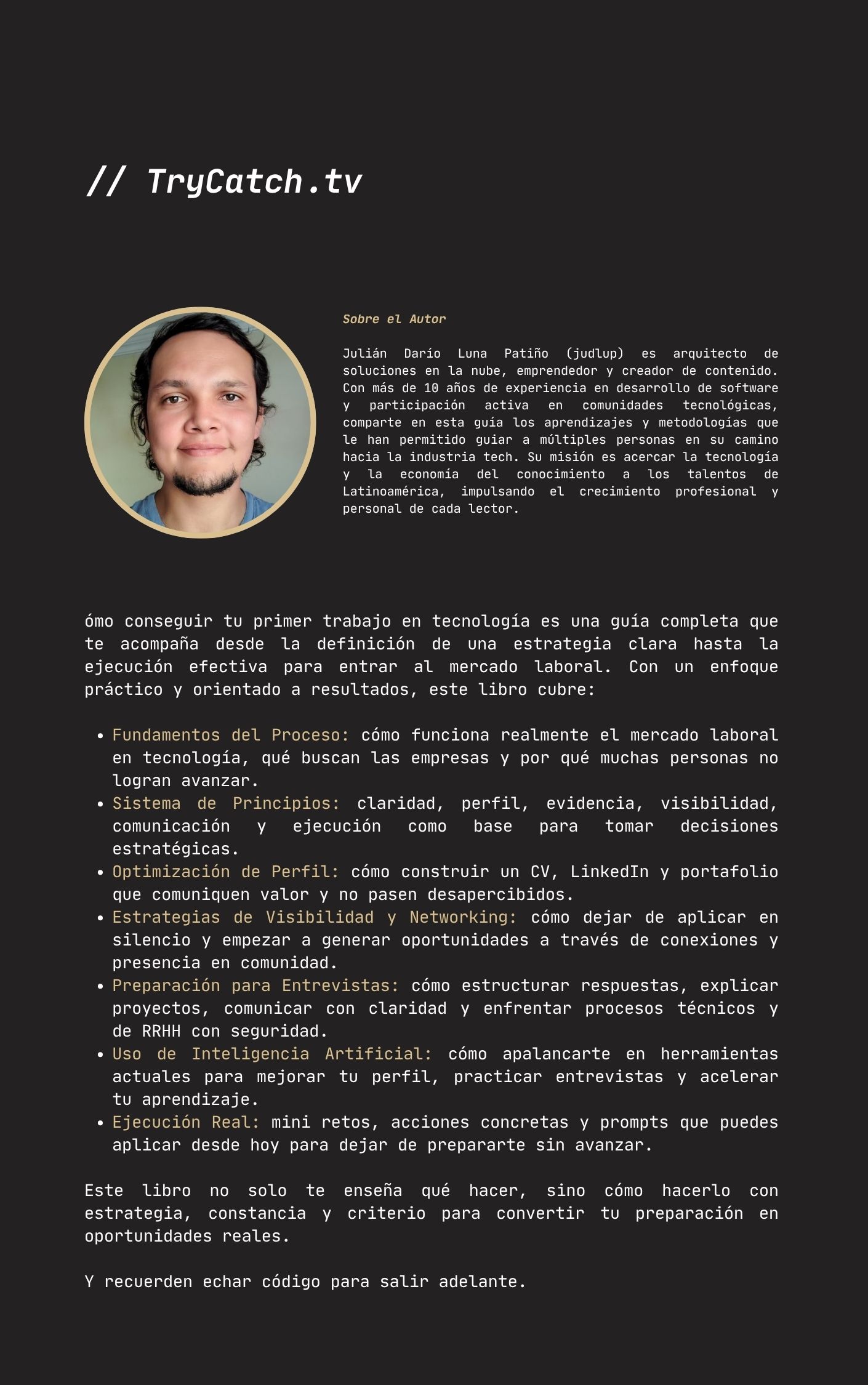 • Porque este libro fue escrito con un propósito: ayudarte a conseguir trabajo en tech con estrategia haciendote la vida más fácil.
